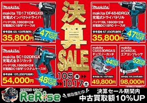 只今、リライズ市川行徳では、決算セールといたしまして、人気工具マキタのインパクトドライバーTD171DRGXをはじめ、充電式工具各種を決算セール大特価にて販売いたしております!