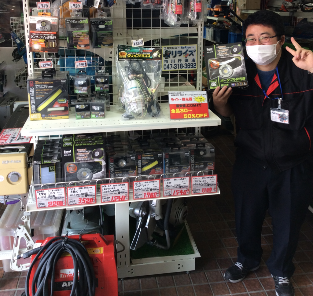 皆さん、こんにちは。リライズ市川行徳店新人藤河です。この度は入り口前の棚に新コーナー【ライト・投光器コーナー】を設置させて頂きました。