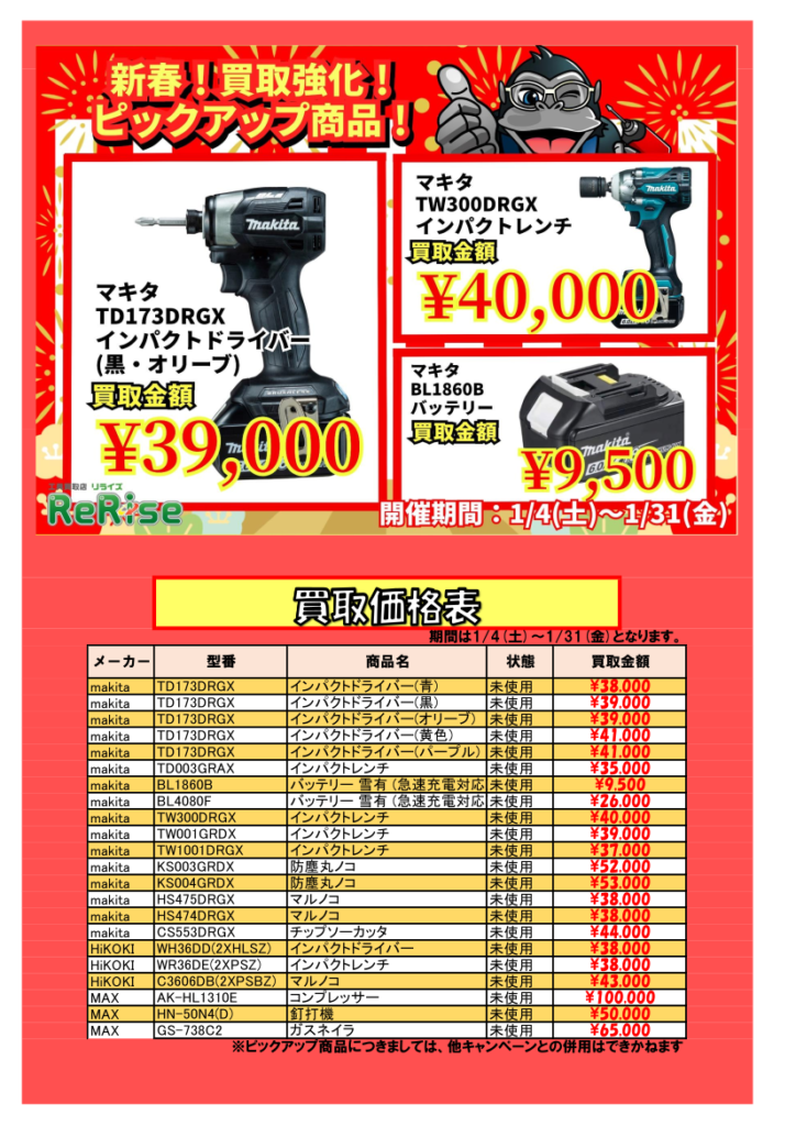 対象工具の買取金額up!