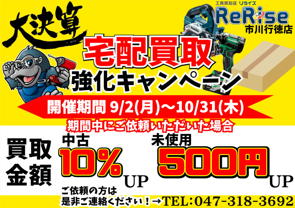 買取金額UP!中古工具20%UP!未使用工具500円UP!