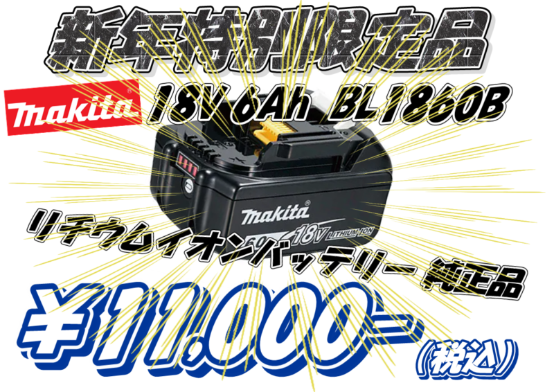 22日までの限定販売品makita 純正バッテリーBL1860B 未使用品が、なんと税込¥11,000- で販売中です★数に限りがありますので早い者勝ちです!!!通常価格より大幅にお買得となっております(^O^)/