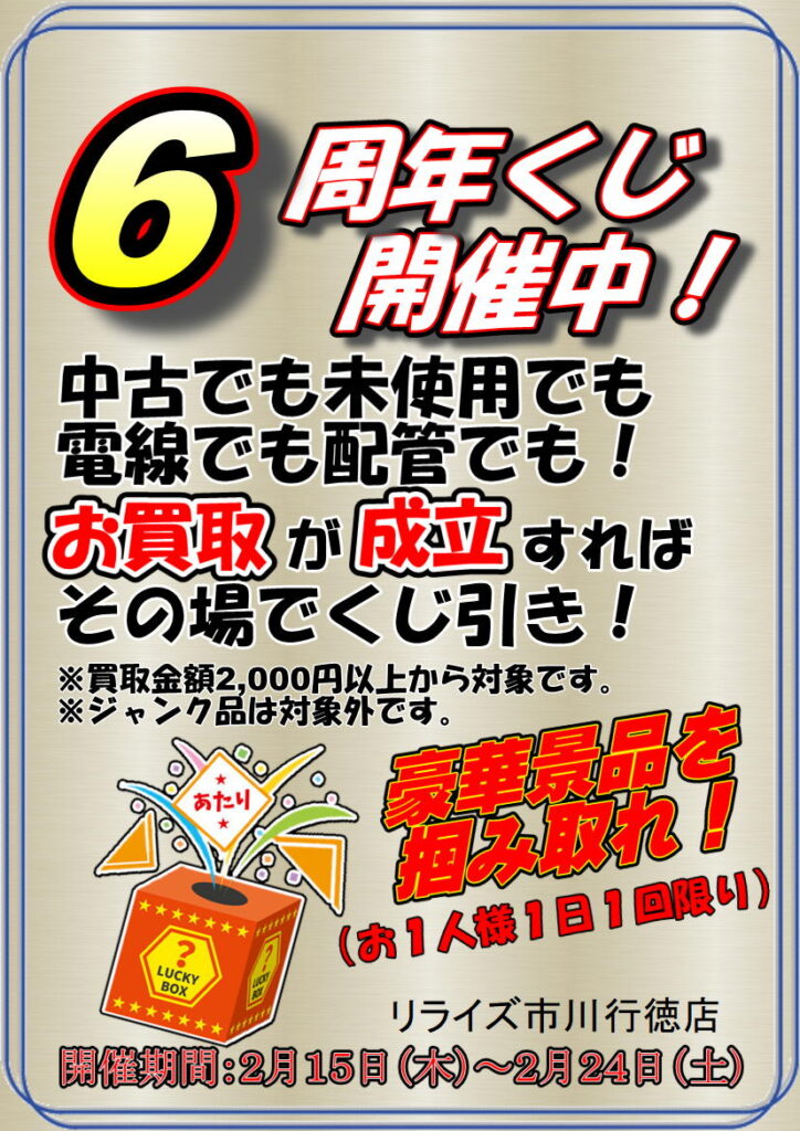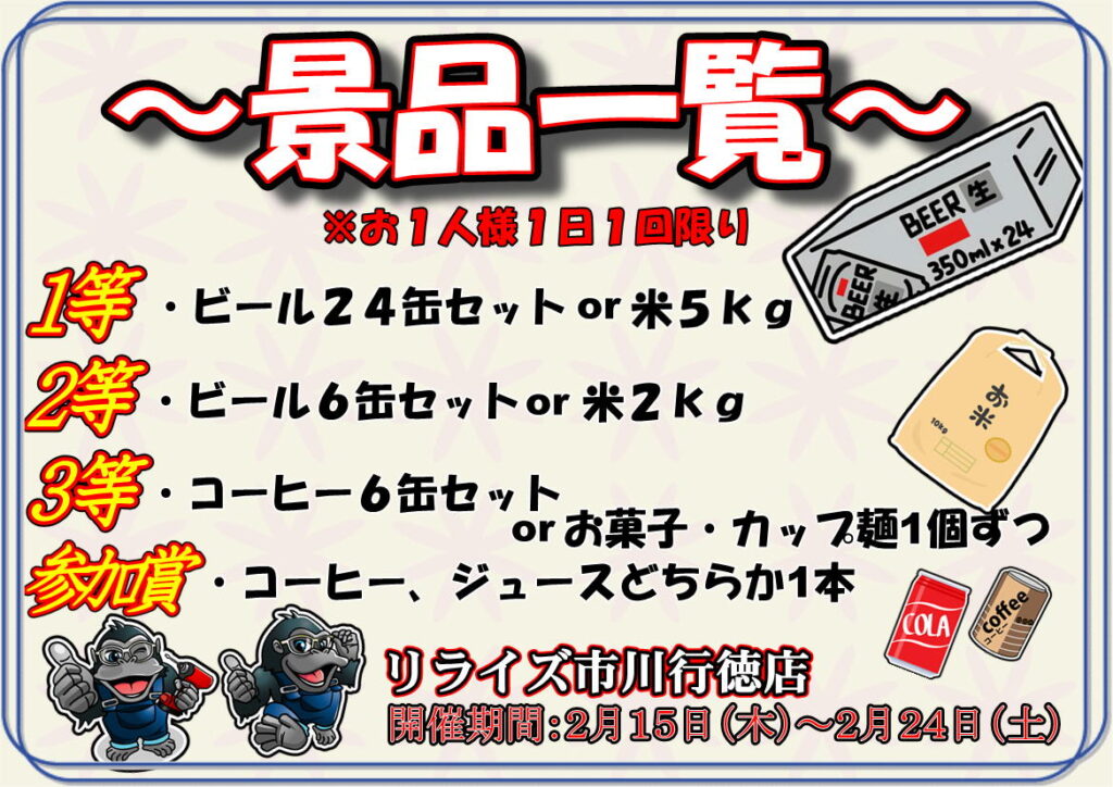市川行徳店では、お買取りサービスの利用時にくじを引いていただくことでビールやお米などの景品が当たるイベントになります!