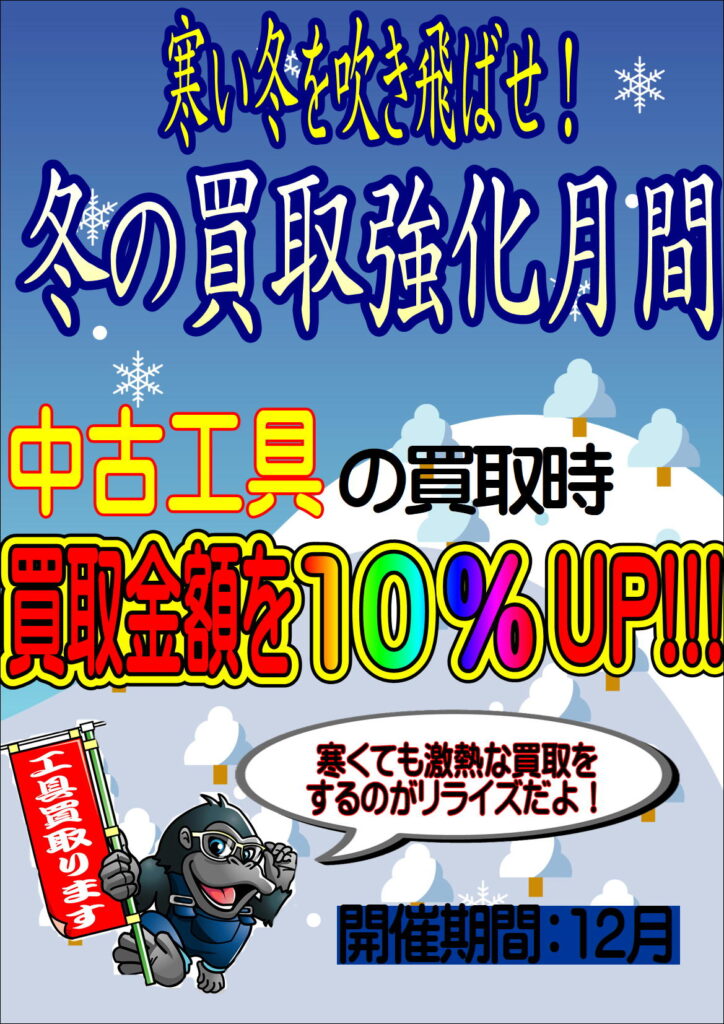 さて、年末といいますと忘年会・クリスマス・お正月の準備と何かと物入りな時期となり、どうしても現金が必要ということも・・・そんな時は工具買取リライズで不要な工具や電材を売って現金化してください!