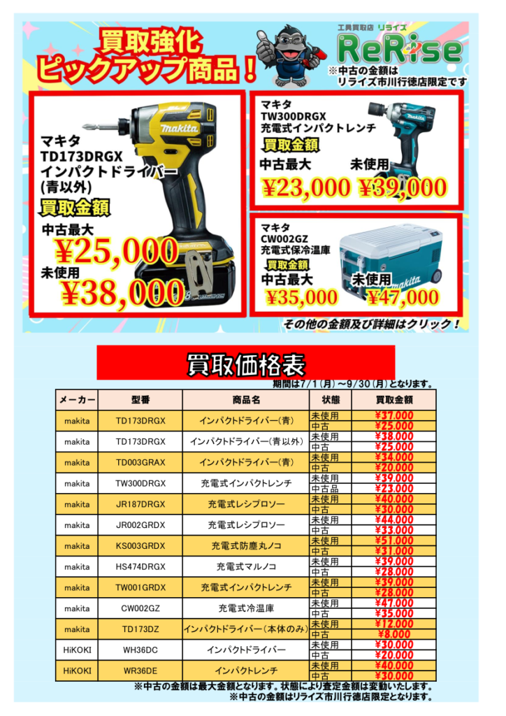 ※中古工具に関しましてはリライズ市川行徳店のみとなります。