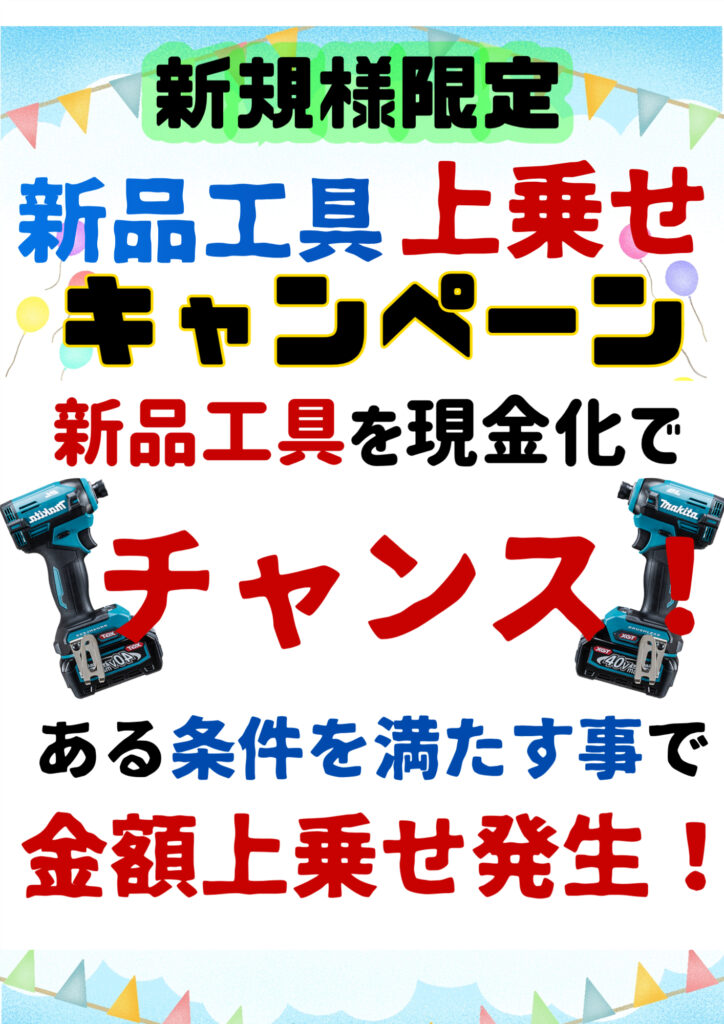 今回はお知らせブログとなります!2024年10月4日からキャンペーンを開始!初めてリライズで新品買取サービスをご利用いただくお客様限定で、「新品工具買取額超上乗せキャンペーン」を実施いたします!