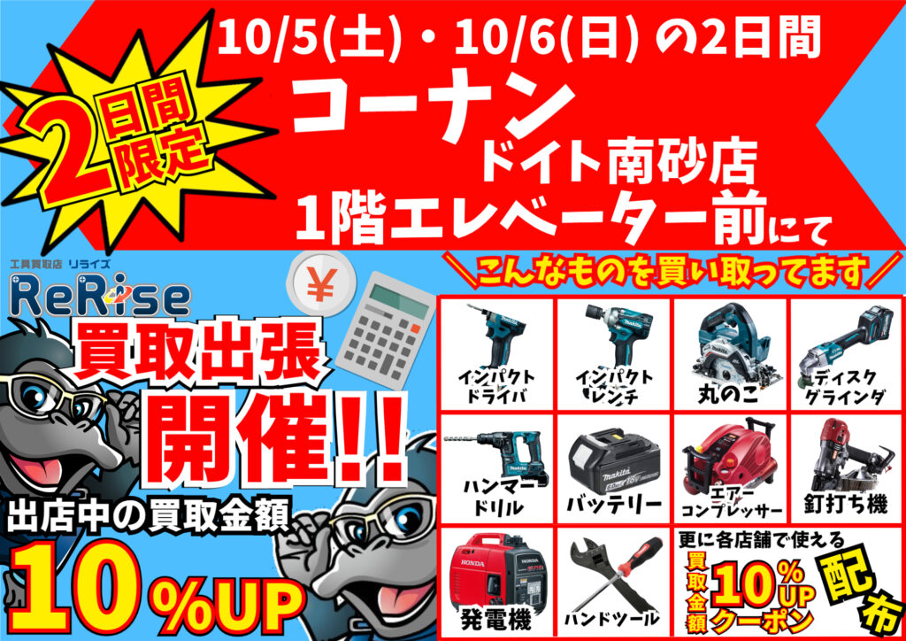 出店現場での中古工具買取金額が常時10%UPいたします!