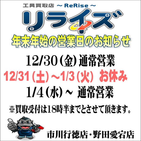 年末年始休業日のお知らせ【野田愛宕店・市川行徳店】