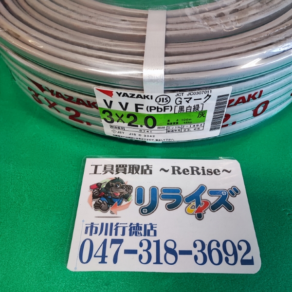 矢崎電線 VVFケーブル2.0mmx3芯 Gマーク(黒白緑) VVF3x2.0