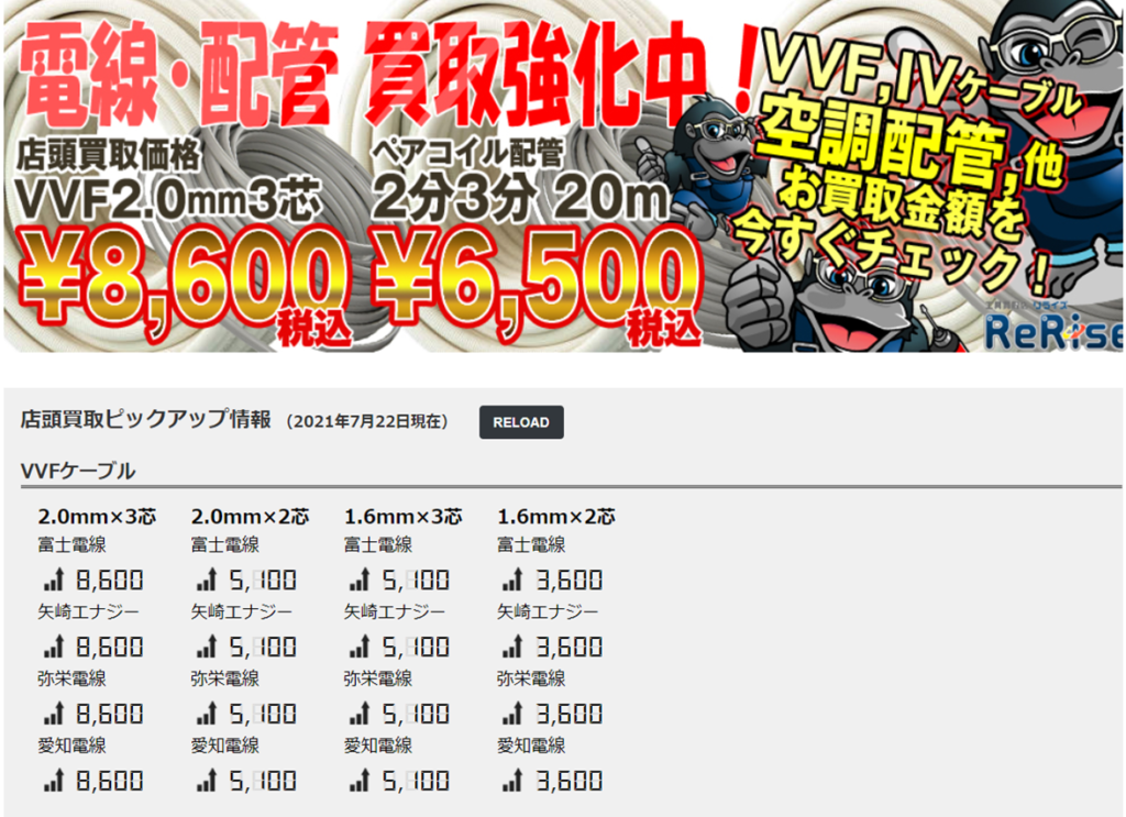 リライズが自信を持ってお届けする電線の現在の買取金額がコチラ↓