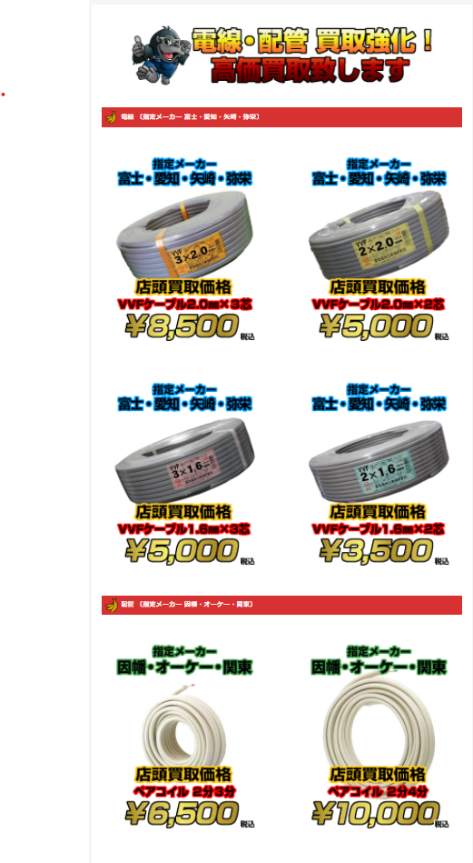 リライズが自信を持ってお届けする電線・配管の現在の買取金額がコチラ↓