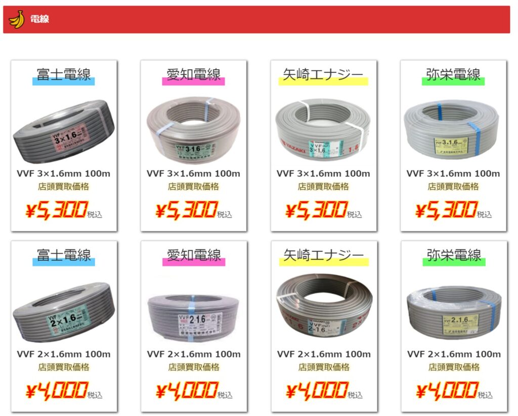 リライズが自信を持ってお届けするVVFケーブル(一般タイプ)の買取金額がコチラ↓