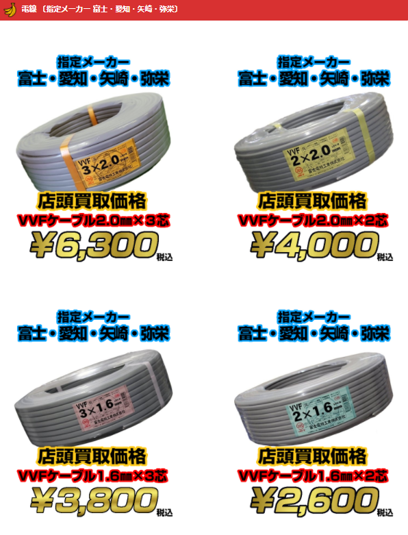 さて、日中もだいぶ暖かくなりました。気温がどんどん上がってくるとエアコン工事関連の需要が拡大していきます。当店ではそんなエアコン工事に欠かせないVVFケーブルの買取強化を大々的に行っております。