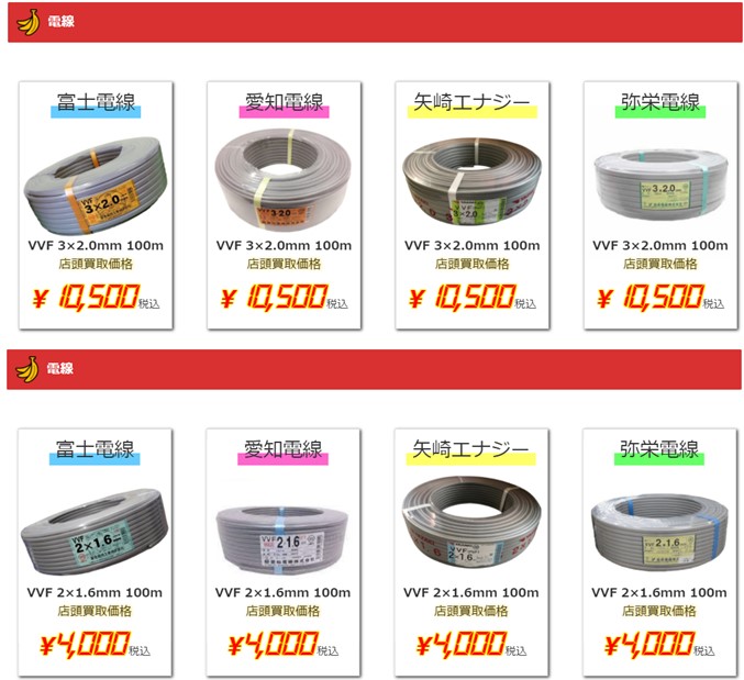 当店ではペアコイル・VVFケーブルの在庫が非常に少ない為電材の買取にもかなり力を入れており、特にVVFケーブルやペアコイルといったエアコン工事部材においては、地域一番の買取を目指しております! この機会に是非お売りください!!