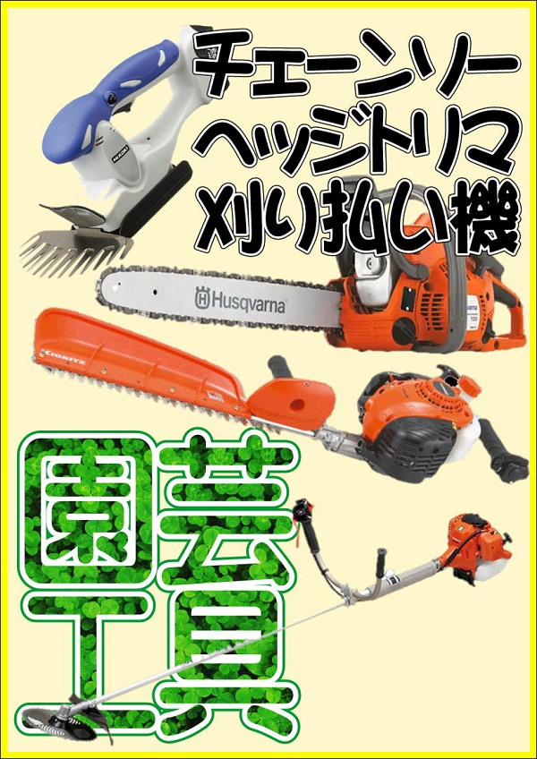 季節柄、チェンソーや草刈機、芝刈機を