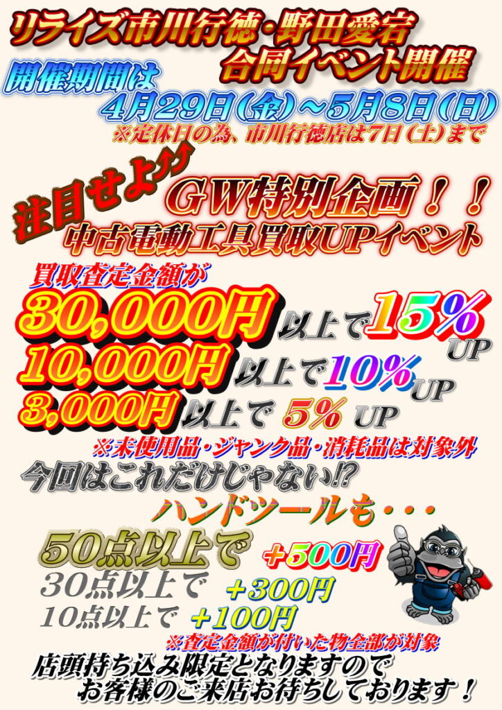 本日はゴールデンウィーク期間で開催しておりました中古電動工具買取UPイベントが当店は明日が定休日となっている為本日が最終日となっております!!尚野田愛宕店は
