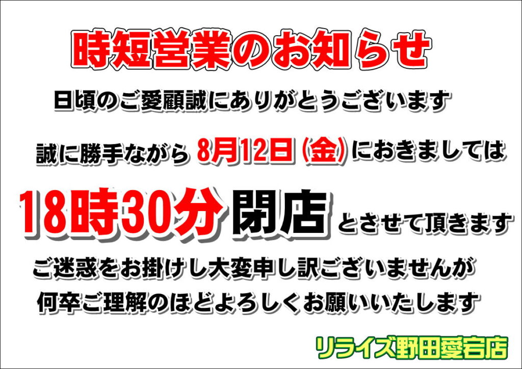 8月12日(金)臨時営業時間変更のお知らせ【リライズ野田愛宕店】